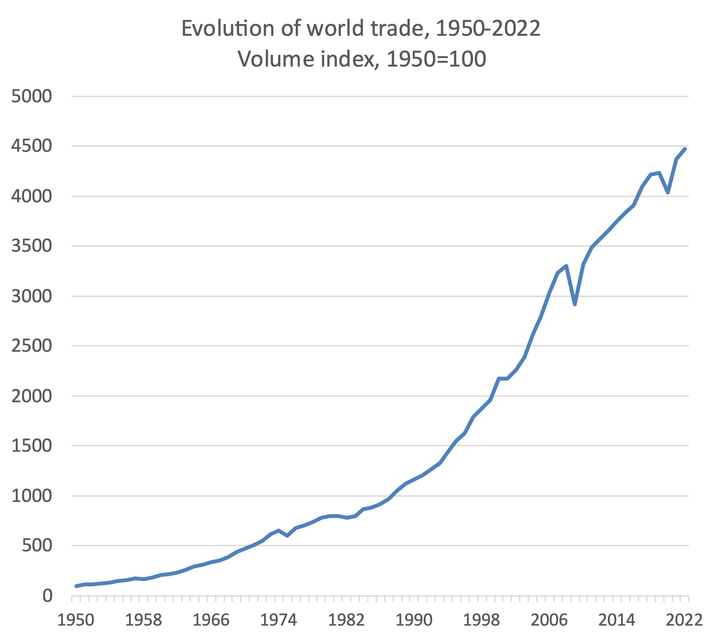 There has been nothing as positive and predictable as the growth of international business. World trade volume today is roughly 45 times the level of 1950. (4,500% growth from 1950 to 2022). Despite the occasional dip due to economic recessions and Covid-19, selling into new markets, and expanding middles classes has benefitted both sellers and buyers.
